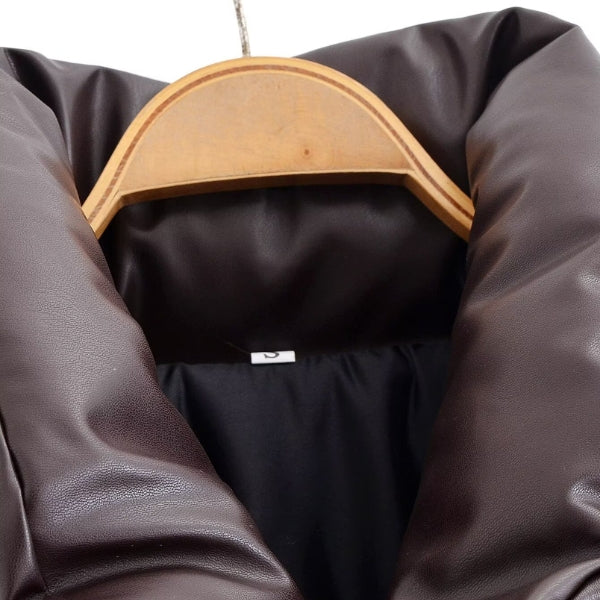 En kvinnes cropped jakke definert av en oversized polstret krage, drop shoulders og en ren frontglidelås. Glatt vegansk lær med en mykt strukturert, puffet form skaper volum uten å føles klumpete. Ideell for lagdeling i kaldt vær over denim, strikkede plagg eller hevede hverdagslooks.
