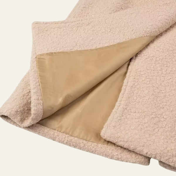 En lang frakk for kvinner med en myk teksturert finish, en avslappet skreddersydd silhuett og et selvsittende belte for definisjon. Den luksuriøse overflaten og de strukturerte reversene gir en hevet, koselig følelse som er ideell for kjøligere dager. Perfekt for lag-på-lag i byen, helgeturer eller polert hverdagsstil.