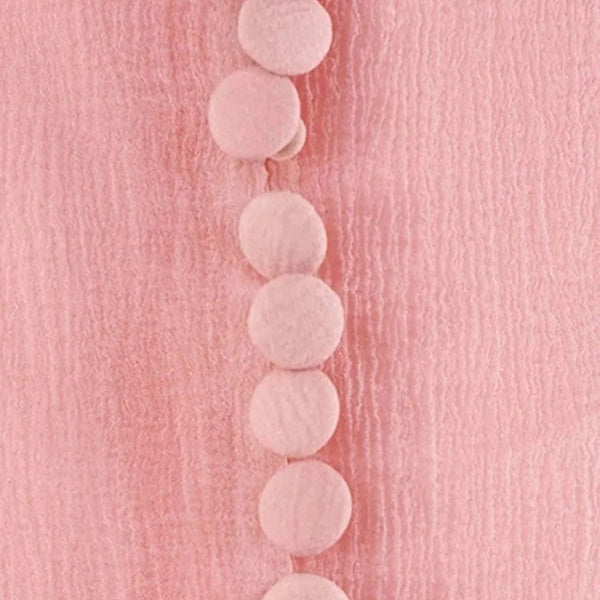 En gjennomsiktig minikjole for kvinner, definert av sitt skulpturerte liv og dramatiske volang-flare ermer og kant. Det lette teksturerte stoffet skaper myk volum, mens knappefrontdetaljen gir et raffinert, skreddersydd preg. Et fremragende valg for kvelder, feiringer eller enhver anledning som krever moderne eleganse med uttrykksfull bevegelse.